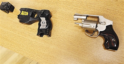 眩晕枪(上)和与贝茨所掏枪支类似的手枪。(图片来源:新华/美联)