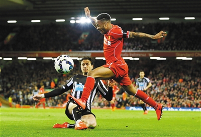 图为利物浦队斯特林(右)与纽卡斯尔联队扬马特在比赛中争抢。 新华社发