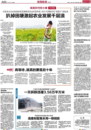 ■ 杨勇“同样种田,先走出一步的可以在土里刨金,循规蹈矩的人只能勉强温饱。”昌江黎族自治县乌烈镇乌烈村委会主任钟国标的这句话,说的是当地农户种植瓜菜等高效作物与种植传统农作物经济效益之间的天壤之别。