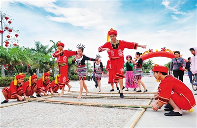 陵水黎族群众在文化广场跳竹竿舞欢度节日。