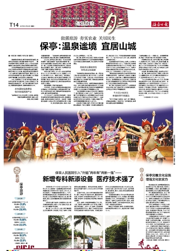 2014年,保亭在忙碌中度过:“红毛丹采摘旅游季”“婚庆旅游季”“温泉美食旅游季”等一系列大型旅游推介活动成功举办;借助三亚“清凉一夏,三亚度假”旅游宣传促销平台,组织旅游企业赴重庆、南京、上海、西安、天津等城市进行推广营销,拓展岛外旅游市场……
