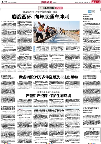 以“加强生态环境保护,合理开发矿产资源”为主题的海南环保世纪行活动坚持“生态立省”、“绿色崛起”战略,宣传《中华人民共和国矿产资源法》及《海南省矿产资源管理条例》执行情况,并结合执法检查内容大力宣传依法管理矿产资源勘查、开采取得的成绩和经验,并曝光存在问题。