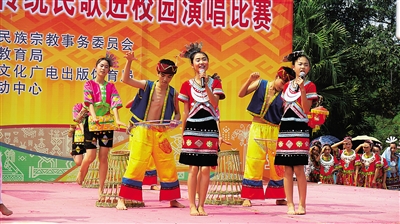 “山兰熟了,山兰熟了……”4月20日晚,在琼中黎族苗族自治县“黎苗花儿朵朵开”“三月三”主题晚会暨“民歌民舞民服三进校园”活动汇报演出现场,琼中中学高二(27)班的黄莹莹身着漂亮的苗族服装,与同学李运圣合唱苗族歌曲《山兰熟了》,她那厚实的音质感动了观众。