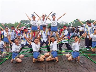 琼中“三进”校园活动把传承黎族苗族舞蹈和早操、课间操等活动结合起来,既锻炼身体,又生动有趣。在下午课间操时间,记者踏入县第二小学时,听到悦耳的“踢踏、踢踏”竹竿落地声,全校600多名小学生在老师的带领下跳竹竿舞。校长王红说,竹竿舞已经成为二小的一个普及项目,每周四下午课间操期间,全校师生齐跳竹竿舞。