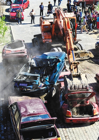 4月29日,一辆挖掘机在销毁非法营运车辆。 当日,乌鲁木齐市城市客运统管办公开销毁60辆非法营运车辆,这些车辆均为违法当事人长期不接受处理,且公告到期达到报废年限的非法营运车辆。 新华社记者 王菲摄