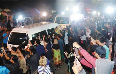 4月29日,在印尼中爪哇省的芝拉扎,人们聚集在运送毒贩遗体的救护车旁。 印尼总检察长办公室当天凌晨宣布,8名分别来自印尼、尼日利亚、巴西和澳大利亚的毒贩于当地时间0时25分在中爪哇省一座监狱岛上被处死。印尼此次原定处死10名毒贩,一名菲律宾籍和一名法国籍毒贩因案件仍处法律程序被临时中止行刑。