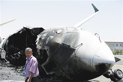 4月29日,在也门首都萨那机场,一名机场工作人员从被空袭毁坏的班机旁走过。为防止一架伊朗飞机在也门首都萨那机场降落,沙特牵头的国际联合阵线战机28日发起空袭行动,炸毁了萨那机场的残存跑道。 新华社/路透