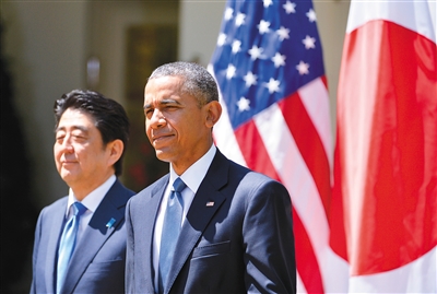 4月28日,美国总统奥巴马(右)和到访的日本首相安倍晋三出席在华盛顿白宫举行的联合记者会。 新华社记者 殷博古 摄