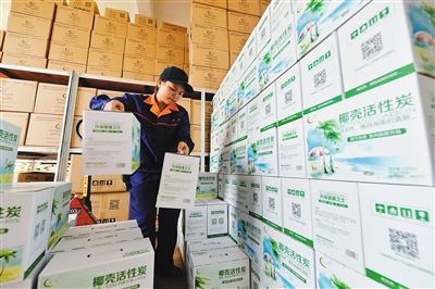 4月28日,文昌市海南星光活性炭有限公司的工人正忙着发货到全国各地。该公司自1996年建厂以来一直是以工业用活性炭为主营方向,经过十多年的发展已成为国内最大的椰壳活性炭生产基地。面对市场需求的多元化和当地政府做大做强椰子产业的要求,去年公司开始拓展民用椰壳活性炭市场,目前已研发用于室内、车内、冰箱、鞋塞等,近25种民用活性炭产品,优良的品质依托“电商”平台,产品供不应求。 本报记者 王凯 摄