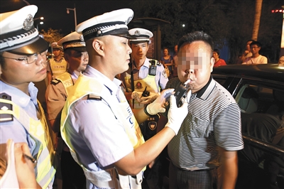 4月29日晚,海口交警在三亚市迎宾路与河西路交叉口,请一位疑似酒驾的司机接受酒精测试。 本报记者 武威 摄