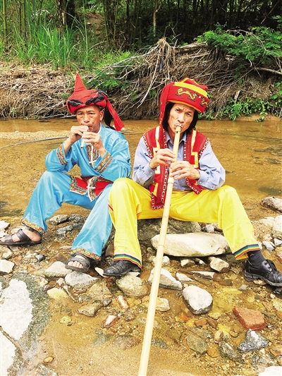 阿陀岭下,小溪旁边,两位民间艺人王照灵(右)与黄启芳一个吹灼吧和一个奏唎咧,自得其乐。