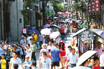 “五一”期间,海口观澜湖华谊冯小刚电影公社准备了丰富多彩的活动,除了街头技艺,还有舞狮等表演,吸引了许多游客。 图为5月2日,“五一”小长假第二天,众多游客在电影公社“1942民国风情街”观光游览,体验“民国穿越”之旅。 本报记者 张茂 摄