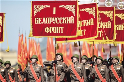 5月9日,在俄罗斯首都莫斯科红场,十个方面军纪念军旗护旗队行进在阅兵式上。 新华社记者 贾宇辰 摄