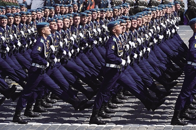 5月9日,在俄罗斯首都莫斯科红场,俄罗斯军人行进在阅兵式上。 新华社/法新