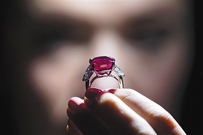 在英国伦敦苏富比拍卖行,这枚鸽血红的缅甸红宝石刷新了红宝石拍卖价的世界纪录。新华社/法新