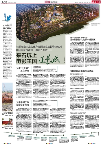 ■ 本报记者 刘贡一个集影视制作、影视娱乐、影视商务、影视演艺、影视教育、影视传媒、影视科技等多功能于一体的超大型国家级国际化电影产业园区、世界级电影娱乐王国——长影海南生态文化产业园,正在海口慢慢形成,项目一期明年国庆节将对外开放。