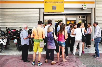 6月29日,在希腊雅典,人们在关闭的比雷埃夫斯银行外的自动取款机前排队取钱。 新华社/法新