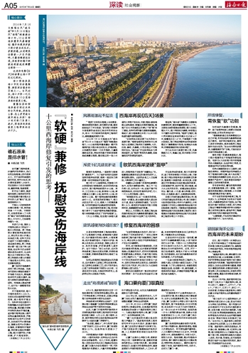 记者在西海岸修复工程现场看到,为了让海堤更为牢固,距离滨海大道较近、无沙滩缓冲的深水堤岸,从海面算起,依次修建有抛石、干砌块石护坡、混凝土四角空心块消浪坡、混凝土亲水平台、弧形防浪墙、护栏廊道等几道防护。设计方表示:“较之台风前,这次的岸线修复工程体系更加完善,防御标准大大提高,防潮排涝建筑物也得到了全面翻新。”