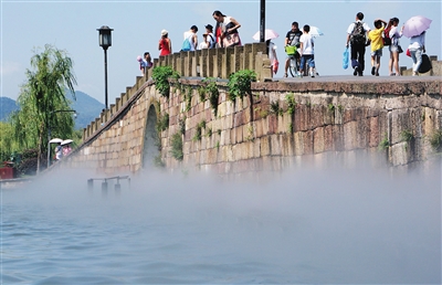 7月27日,游客在杭州西湖断桥享受人造喷雾带来的清凉。 当日起,因杭州持续晴热高温和应广大游客的要求,西湖断桥每日上午9点30分至10点开启喷雾装置,让游客享受人造喷雾带来的清凉。 新华社发(吴煌 摄)
