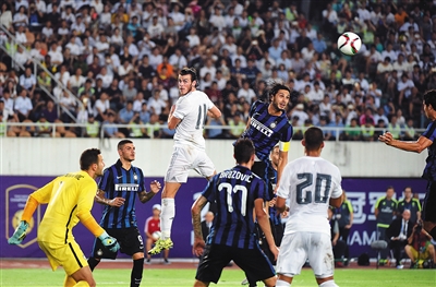 7月28日,在广州进行的2015国际冠军杯中国赛广州站比赛中,皇马凭借赫塞、瓦拉内以及J罗的进球,以3:0大胜国米。图为皇马球员贝尔(左三)在国米队门前争顶。 新华社发