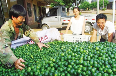7月27日,国营东昌农场十九队(南隆园村)群众在分捡青皮酸桔,准备打包发货。这种青皮酸桔四季均长果,一株可达到120多斤;而收购价均达到了每公斤10至14元的高价,令全村群众乐开了怀。