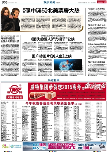 新华社洛杉矶8月2日电 (记者张超群)汤姆·克鲁斯主演的第五部《碟中谍》系列影片《碟中谍5:神秘国度》在北美上映首周末获得5600万美元票房,远超第二名《假期历险记》,勇夺票房冠军。《碟中谍5》周五在北美3956家影院开画,首日便获得2030万美元票房,创《碟中谍》系列上映首日票房纪录。该片周末三天票房收入5600万美元,在《碟中谍》系列中仅次于2000年的《碟中谍2》,后者当年开画周末三天票房达5780万美元。自1996年第一部《碟中谍》上映,19年中共有5部该系列影片问世,迄今全球累计票房22.2亿美元。