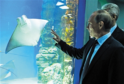 8月4日,在俄罗斯首都莫斯科的海洋生物馆,俄总统普京向水箱中的鱼儿招手。 当天,普京参观了莫斯科海洋生物馆。