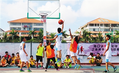 2015年海口市体育嘉年华青少年街头体育季5日继续在海口世纪公园举行。2000多名海口青少年相继参加彩色潮跑、三人足球、三人篮球、滑板、街舞和“全民健身日”体育游园六大项。图为选手在三人篮球比赛中。 周才能 摄