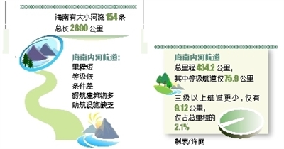 “海南内河水运依然处于发展空白,内河航道未能得到合理的开发和利用。”省港航管理局相关负责人表示,海南内河航道里程短、等级低、条件差、碍航建筑物多,助航设施缺乏,落后内河航运使很多内河旅游项目没有开发条件。