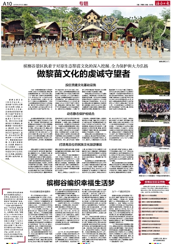 多举措助推黎族苗族文化的弘扬,为黎族苗族文化静态、动态保护上双保险。第一,积极推广普及民族乐器,以保亭黎族地区传统器乐为代表,挖掘整理黎族器乐八大件:鼻箫、灼吧、唎咧、口弓、哔哒、口拜、独木鼓、叮咚,整理、创作黎族苗族传统歌舞、器乐节目,参加全省少数民族文艺汇演、泛珠三角“9+2”民间艺术表演大赛、全省广场文艺汇演等省内外文艺比赛均获得嘉奖;景区还积极加强项目代表性传承人的培训工作,培养年轻传承人,使传承人能掌握黎族苗族非物质文化遗产系列项目的制作技艺。第二,聘请专家导演并编排了大型黎苗歌舞——《槟榔·古韵》,还原黎族苗族生活场景,以歌舞的形式呈现给观众。大型原生态黎苗歌舞《槟榔·古韵》的推出受到中外广大游客的热捧,近两年来,《槟榔·古韵》演艺队伍足迹遍布青岛、大连等国内城市,以及澳大利亚、新加坡、西班牙、俄罗斯、阿拉伯联合酋长国等国家,率先实现海南文化与旅游相结合必须“打造高品质旅游演艺产品”的目标。第三,参与并出版了《黎族文身新探》、《海南黎村苗寨》、《槟榔风情》等系列书籍,书籍以图文并茂的方式,真实地记录了海南黎族苗族悠久的传统文化和现代生产生活状况,反映了海南黎族、苗族地区的发展变迁,为黎族苗族文化资料的收集、整理、保存和传播提供了重要文献依据,是发展海南旅游业不可或缺的人文资源。