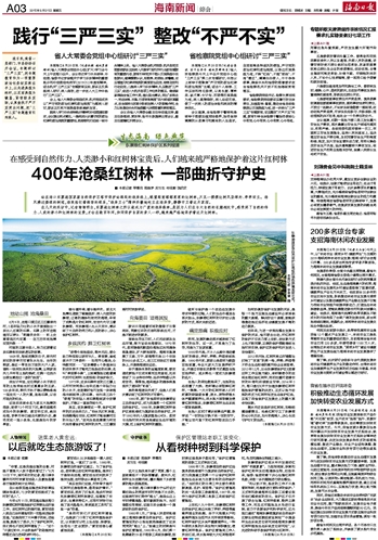 2012年开始,红树林周边环境整治打响了“改革”的第一枪,养鸭、养猪等不符合生态标准的高污染企业被取缔;2013年12月,出台东寨港保护区《退塘还林工作实施方案》,将虾塘侵夺的空间全部还给红树林,同时注重对退塘农民的补偿和后续就业安排;2014年3月,海口通过《关于加强东寨港红树林湿地保护管理的决定》,正式以地方法规的形式为红树林划定生态保护红线,实现了我省保护区发展史上的重大革命性创新。