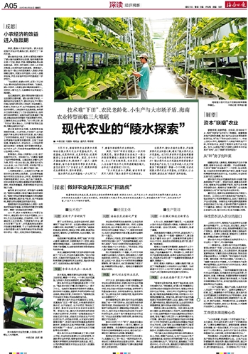 量的积累已经完成,质的提升亟需推进。“海南农业需要从每亩产量向每亩效益转变。”海南大学经济管理学院副院长柯佑鹏教授说,需要精心算好亩产投资、亩产效益细账,探索出符合海南实际的现代农业。