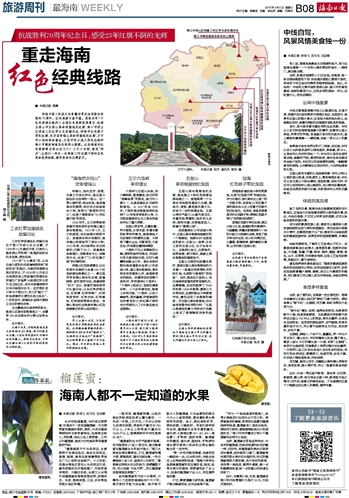 ■ 本报记者 侯赛时值中国人民抗日战争暨世界反法西斯战争胜利70周年, 红色旅游日益升温。我省共有7个红色旅游点被列入全国红色旅游经典景区,包括五指山市五指山革命根据地纪念园、海口市琼山区琼崖工农红军云龙改编旧址、琼海市红色娘子军纪念园、定安县母瑞山革命根据地纪念园、万宁市六连岭革命遗址、文昌市张云逸大将纪念馆和海口市解放海南岛战役烈士陵园。这些海南的红色旅游景点你去过几个?三天小长假,看完“阅兵”,让我们一同走一走海南23年红旗不倒的红色革命经典线路,感受革命的光辉岁月。