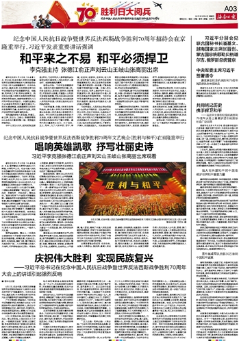 在喜庆欢乐的乐曲声中,习近平同中外领导人共同举杯,同庆中国人民抗日战争暨世界反法西斯战争胜利70周年,共同祝愿世界和平。