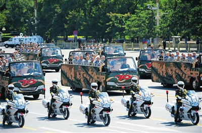 抗战老兵乘车方队由摩托车方队护卫,享受“国宾”待遇。 新华社记者 薛玉斌 摄