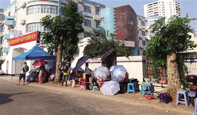 为了能让孩子进校上学,100多名家长提前一天在一学校门外冒着烈日排队,希望能领取到孩子上学的“入校券”。 本报记者 张杰 摄