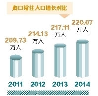 随着海口经济的不断增长和城镇化步伐的加快,海口市常住人口年年上升。据统计部门权威数据显示,2011年,海口市常住人口209.73万人,2012年常住人口214.13万人,2013年常住人口217.11万人,至2014年底,海口市常住人口220.07万人,也就是说,海口常住人口每年在以3-4万人的速度递增,按照国家标准,以在校生人数占人口总数约1.3%的比例计算,仅这部分增加的学生数每年约520人。