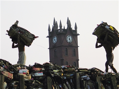 正在背运货物的农民工。农民工们承担着城市里大部分繁重的工作,他们用辛勤劳动为城市增辉添彩。 本报记者 张茂 摄