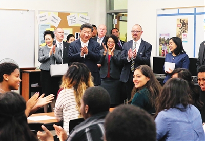 随后,习近平夫妇走进教室,同师生们交流。师生们齐声用中文“你好”欢迎习近平夫妇。师生们有的描述了游历中国的经历,有的表达了去中国看看的向往,对中国文明、中国人民的喜爱溢于言表。习近平对师生们热爱中国表示高兴,欢迎大家多去中国看一看。习近平指出,中国文化博大精深,双方应当相互借鉴,取长补短,共同提高。教育可架起一座桥梁,把中美两国人民联系在一起。