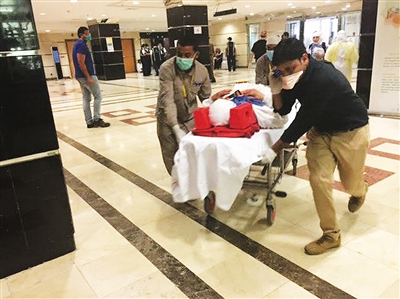 9月24日,在沙特麦加朝觐地米纳,医护人员救援踩踏事件受伤者。 新华社发(萨巴格网站供图)