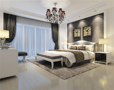 设计说明:主卧为业主设计了单独的衣帽间及开放式的浴缸。色调方面,以白色调为主,大量运用爵士白的仿大理石,让整个空间明亮又不单调,加上银色的点缀营造高贵气氛,使空间更典雅,从而在不经意之间流露出细致的生活品质。
