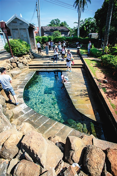 在澄迈县美郎村,游客与摄影爱好者正在观赏三眼古井。 写煌 摄
