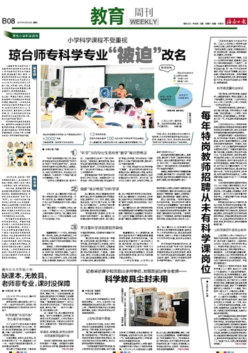 不止白马井实验学校如此。有着947名学生的大成中心学校,全校6名科学课老师,均非科班出身,多由数学老师兼任。学生的科学课同样教材不足。学校没有实验室,实验器材也非常少,课堂实验非常少。