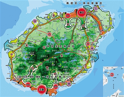 开发建设结构:建设海口、澄迈、文昌一体化的琼北综合经济圈和三亚、陵水、乐东、保亭一体化的琼南旅游经济圈,辐射带动全省;以高速公路、高速铁路、滨海旅游公路、机场港口为依托,优化全省城镇、旅游度假区和产业园区布局;加快特色产业小镇和美丽乡村建设,形成“日月同辉满天星”的开发建设结构。以海南岛及三沙市主要岛礁为依托,加强海上基地、机场航空、港口码头等基础设施建设,建立“布局合理、配套完善、保障有力”的海洋资源开发格局。