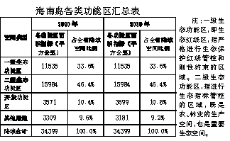 根据全省“一点两区三地”的战略定位,结合海南岛屿省特征、生态环境承载能力和现状发展基础,按照“严守生态底线、优化经济布局、促进陆海统筹”的空间发展思路,统一筹划海南本岛和南海海域两大系统的环境保护、资源利用、设施保障、功能布局、经济发展,在构建全省生态安全格局,保护好海南绿水青山、碧海蓝天的基础上,调整优化全省开发建设空间,合理配置资源,促进海南全面健康可持续发展。2030年,海南岛陆域空间中,一级生态功能区面积11535平方公里,占全岛陆域面积的33.6%;二级生态功能区面积15984平方公里,占全岛陆域面积的46.4%;开发功能区面积3699平方公里,占全岛陆域面积的10.8%。
