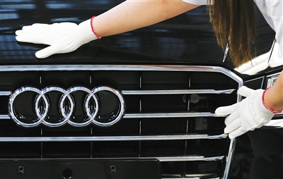 这是2015年5月21日,一名工人在德国内卡苏尔姆的工厂内为一辆奥迪车安装标志的资料照片。 新华社/路透