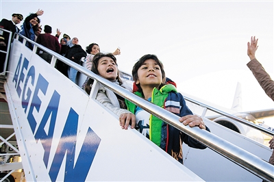 11月4日,首批30名难民从希腊首都雅典启程飞往卢森堡,这是希腊首次根据欧盟难民转移安置计划将难民送往欧盟其他国家。这些难民来自4个叙利亚家庭和2个伊拉克家庭。 新华社/法新