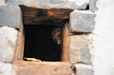 见有陌生人来,王某先是躲在黑暗里探头,后来便继续蹲在地上,不停地抠弄墙砖。