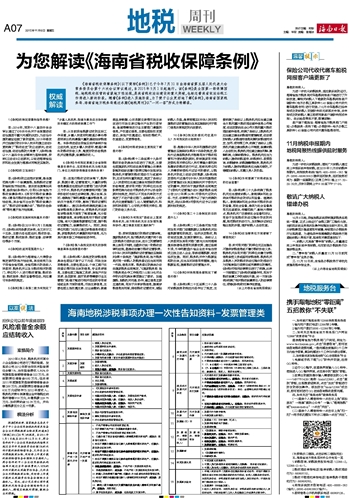 《海南省税收保障条例》(以下简称《条例》)已于今年7月31日由海南省第五届人民代表大会常务委员会第十六次会议审议通过,自2015年9月1日起施行。该《条例》是全国第一部保障国税、地税税收征管的省级地方性法规,是我省税收法治建设的重大突破,也标志着我省依法治税工作将进入新的阶段。随着《条例》进入实施阶段,为了便于公众更好地了解《条例》,海南省国家税务局、海南省地方税务局通过本期《地税周刊》以“一问一答”形式为您解读。