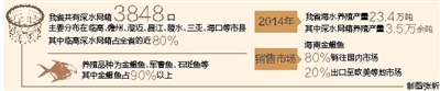 据省海洋与渔业厅统计,目前我省共有深水网箱3848口,主要分布在临高、儋州、澄迈、昌江、陵水、三亚、海口等市县,其中临高深水网箱占全省的近八成;养殖品种为金鲳鱼、军曹鱼、石斑鱼等,其中金鲳鱼占90%以上。去年,我省海水养殖产量23.4万吨,其中深水网箱养殖产量3.5万余吨。从销售市场来看,海南金鲳鱼约八成销往国内市场,其余出口至欧美等地市场。
